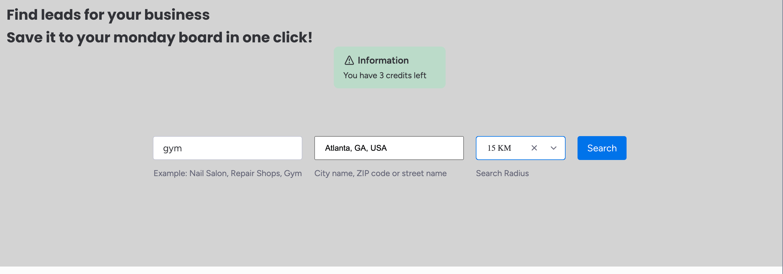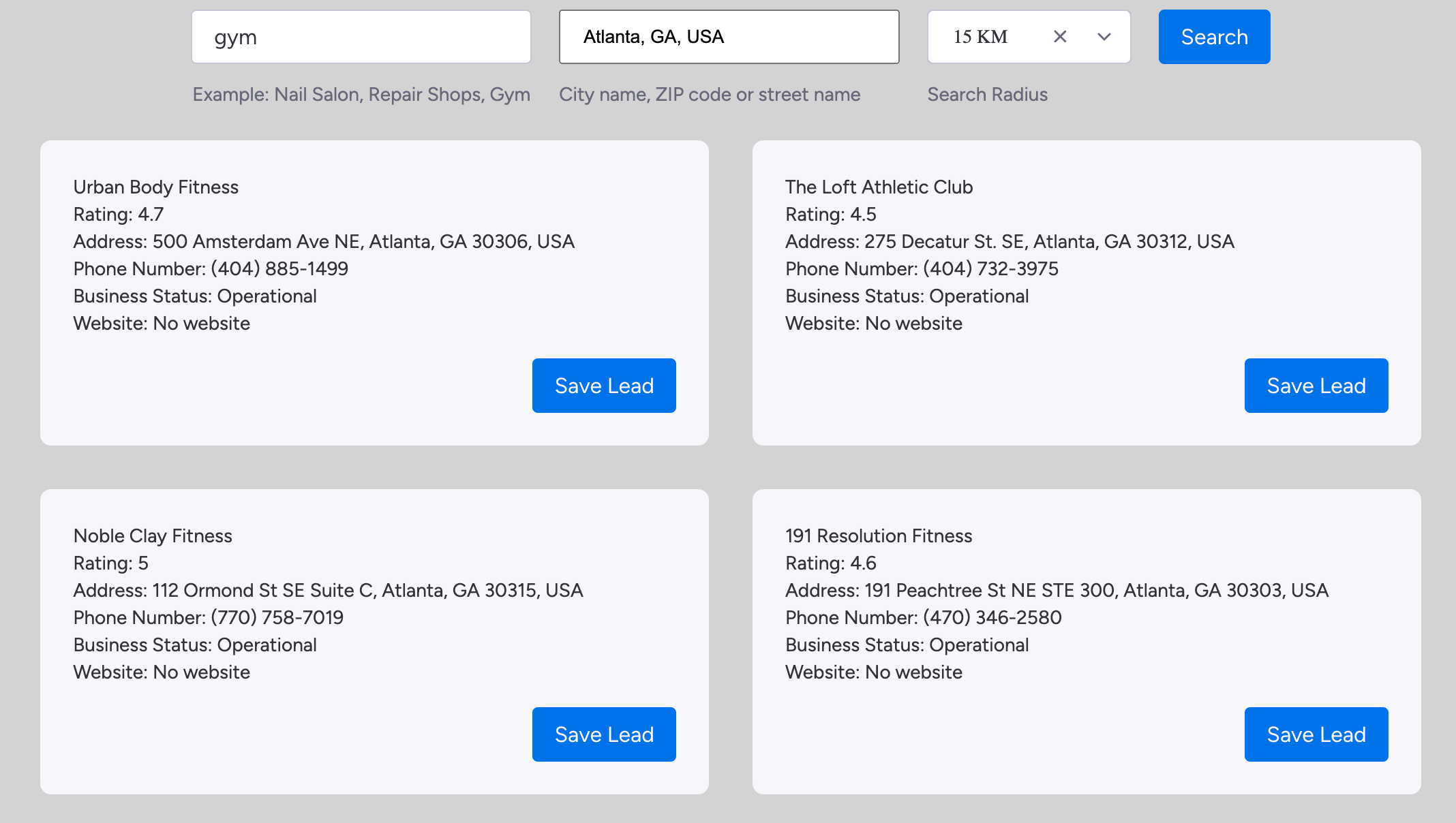 1. Type in niche or keyword and then select location and radius. And then click search button. For example here I'm looking for a Gym in Atlanta within 15 km radius.